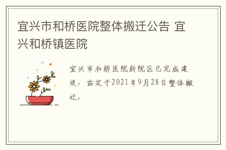 宜兴市和桥医院新院区已完成建设,兹定于2021年9月28日整体搬迁。现将有关事项公告如下: