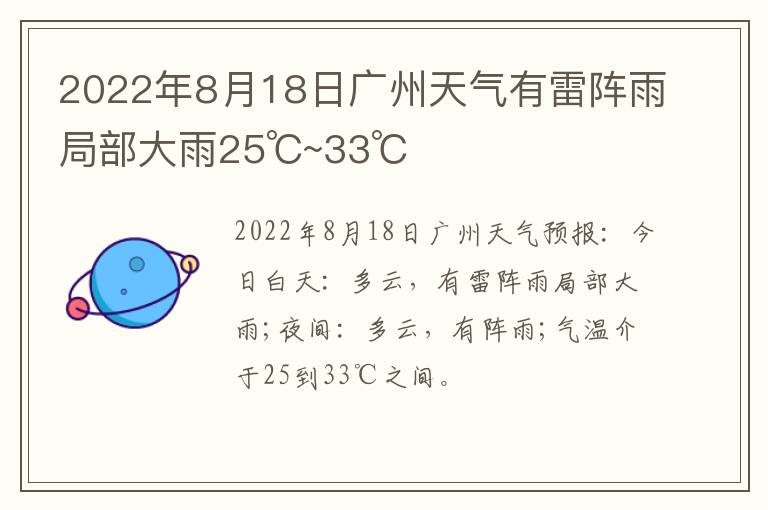 据广州市气象台预测:今日白天:多云,有雷阵雨局部大雨;夜间:多云,有阵雨;气温介于25到33℃之间;相对湿度介于65~95%之间;吹轻微的东南风。(广州市气象台2022年08月18日07时发布)