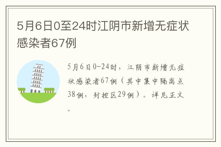 5月6日0-24时,我市新增无症状感染者67例(其中集中隔离点38例,封控区29例)。上述人员均已按要求转运至无锡市定点诊疗机构,涉及病例居所、工作场所、经停的重点区域已迅速落实管控措施。