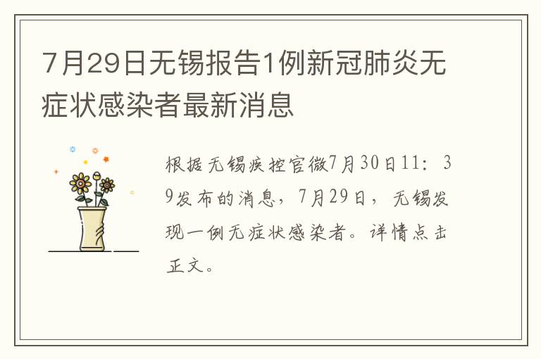 7月29日,无锡市在对境外输入病例服务保障人员的例行核酸检测中,发现1人呈阳性,初步诊断是与境外输入病例相关的无症状感染者。