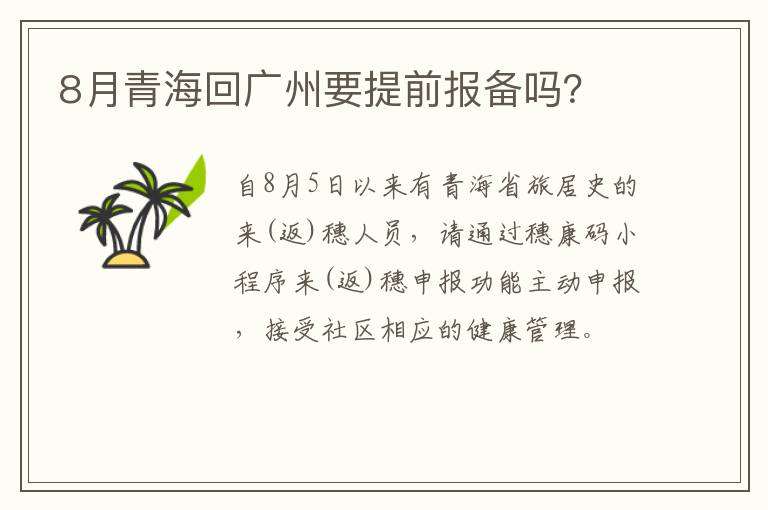 自8月5日以来有青海省旅居史的来(返)穗人员,及所有穗康码“红码”和“黄码”人员,请跟所在社区(村)、单位、酒店主动报备,或者通过穗康码小程序来(返)穗申报功能主动申报,接受社区相应的健康管理。