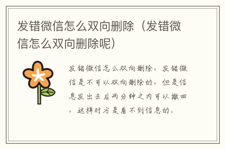 发错微信怎么双向删除,发错微信是不可以双向删除的,但是信息发出去后两分钟之内可以撤回,这样对方是看不到信息的。
