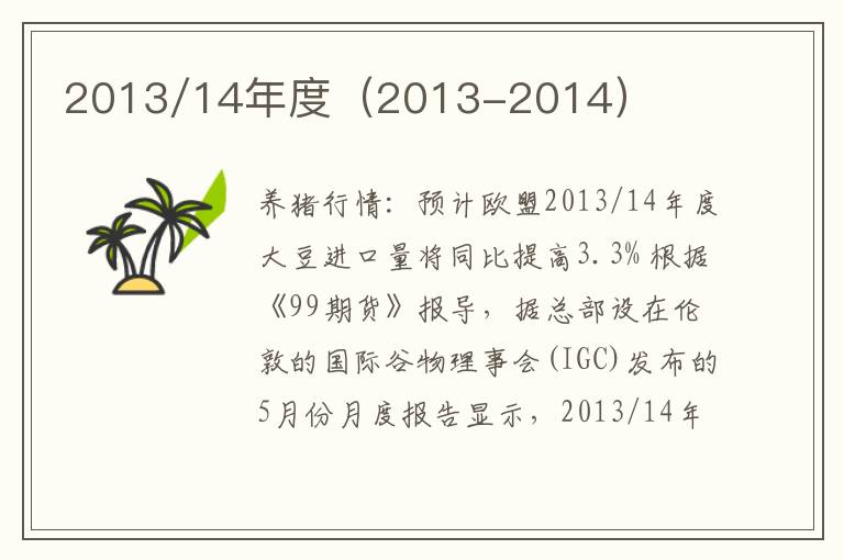 IGC称,2013/14年度欧盟大豆产量预计将达到100万吨,和早先预测持平,高于上年的90万吨。