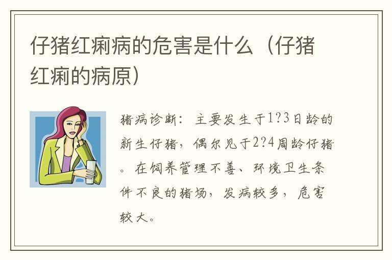 猪病诊断:主要发生于1?3日龄的新生仔猪,偶尔见于2?4周龄仔猪。在饲养管理不善、环境卫生条件不良的猪场,发病较多,危害较大。