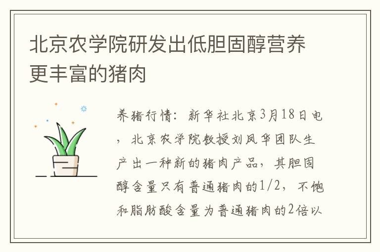 新华社北京3月18日电,北京农学院教授刘凤华团队生产出一种新的猪肉产品,其胆固醇含量惟独普通猪肉的1/2,不饱和脂肪酸含量为普通猪肉的2倍以上。这种猪肉产品不久前已获得流通允许证,即将在北京上市。