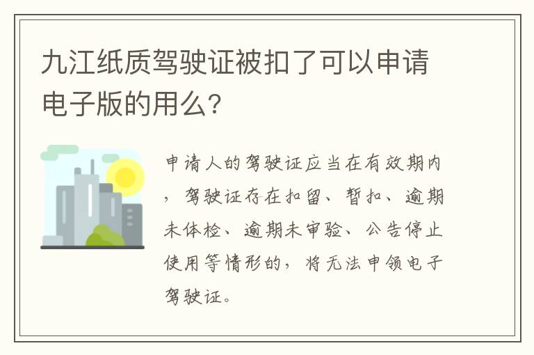 申请人的驾驶证应当在有效期内,驾驶证存在扣留、暂扣、逾期未体检、逾期未审验、公告停止使用等情形的,将无法申领电子驾驶证。