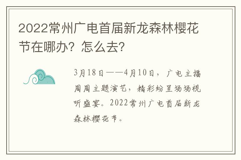 3月18日——4月10日,广电主播周周主题演艺,精彩纷呈场场视听盛宴。2022常州广电首届新龙森林樱花节。