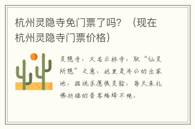 2020年上半年,为贯彻落实市委、市政府《关于疫情防控期间支持旅游行业共渡难关的补充意见》精神,回馈市民游客以及社会各界多年来的关心厚爱,结合当前疫情防控特殊环境,5月1日前,西湖景区16处收费公园景点免费开放!目前免费时间已过,而且当初免费名单里面并没有灵隐寺。