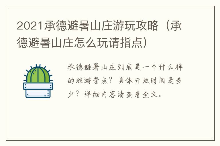 承德避暑庄是中国古代帝王宫苑,清代皇帝避暑和处理政务的场所。位于河北省承德市市区北部。始建于1703年,历经清 康熙、雍正、乾隆三朝,耗时89年建成。与全国重点文物保护单位颐和园、拙政园、留园并称为中国四大名园,为第一批全国文明风景旅游区示范点。1994年12月,避暑山庄及周寺庙(热河行宫)被列入世界文化遗产名录。2007年5月8日,承德避暑庄及周寺庙景区经国家旅游局正式批准为国家5A级旅游景区。