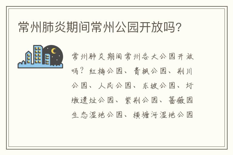 常州市公园管理中心所属红梅公园、青枫公园、荆川公园、人民公园、东坡公园、圩墩遗址公园、紫荆公园、蔷薇园生态湿地公园、横塘河湿地公园、荷园、西林公园、五星公园等自2020年2月24日6时起实行有序开放。
